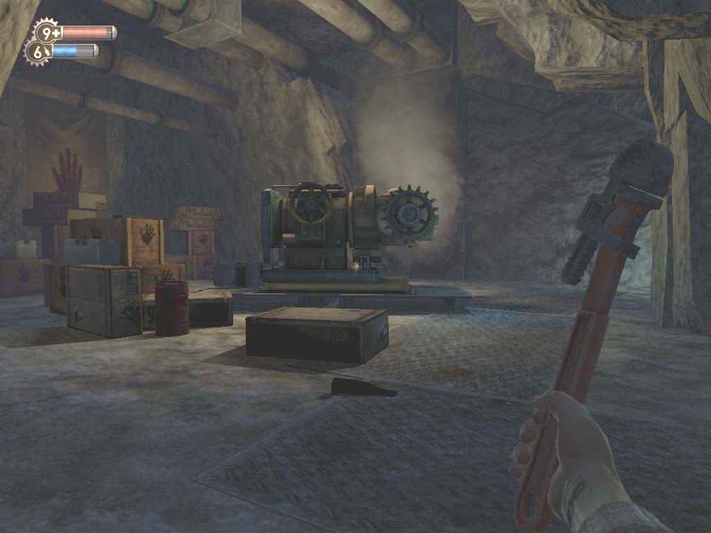 The ground here is strewn with crates and debris and sifting through I find a couple of medical kits which I collect gratefully. The tunnel is completely gone now, replaced by man made corridors which wind around offering different views of the submarine as I go.