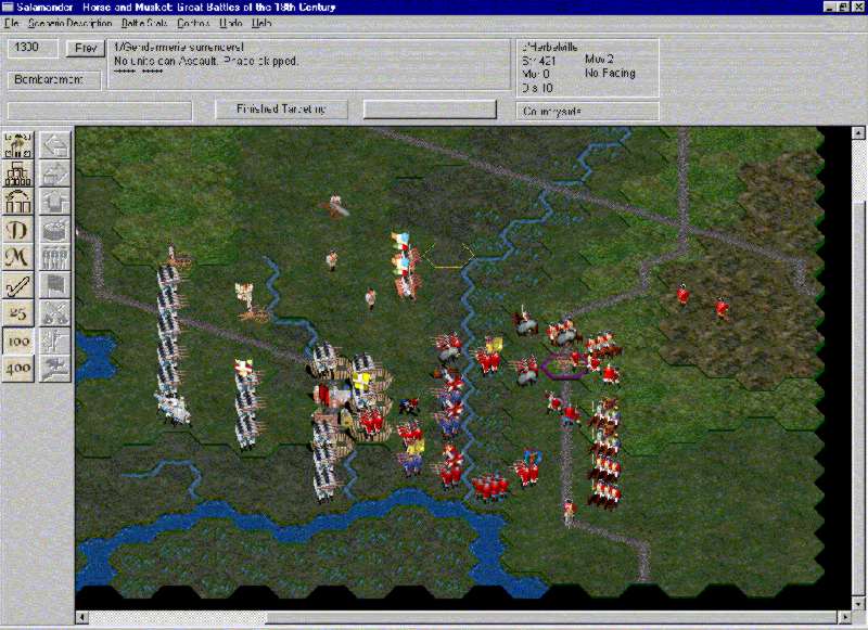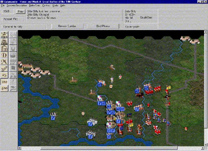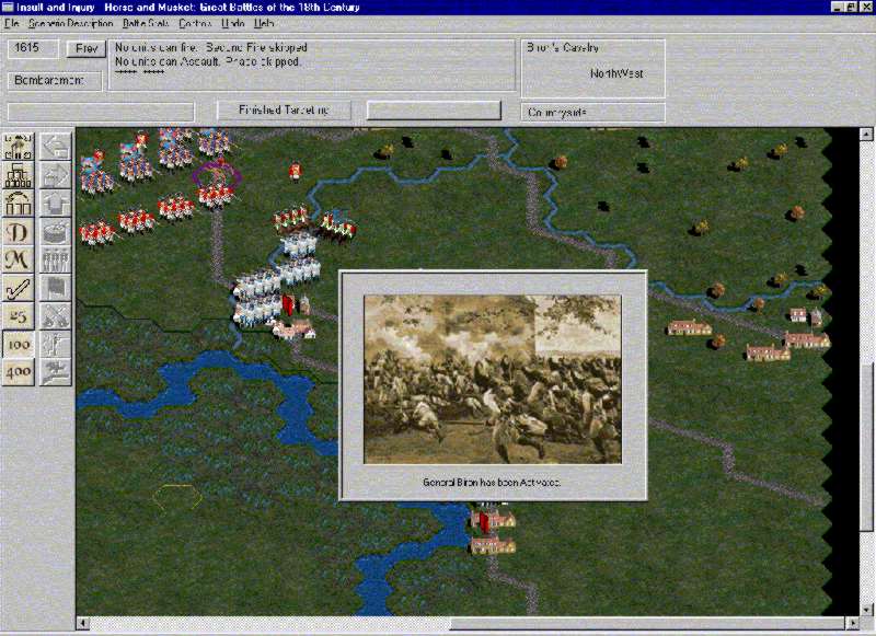 Fig. 3. General Biron gets to issue ordersAfter the player selects a unit, he can order it to turn or move, change formation, recover from disruption, or charge or assault. If the units are adjacent to each other, the player can order his units to fire by clicking on a shooter and on a target. This is where the game becomes cumbersome. While I find the activation of leaders to command certain units representative of war in the 18th century, the resolution of combat unit by unit is not a good display of how things happen. All combat should be resolved simultaneously even in the 18th century, many units conducted activities at the same time. There is no reason why a computer game, unlike a board or miniatures game, should not support this as a feature. This mistaken implementation prolongs the game and inhibits pleasure.