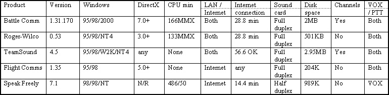 Except for Speak Freely, that has some missing gaming features because it was never designed for online gaming communications, all these programs work well for this task. It really comes down to what you want. Flight Comms is small, has no registry entries, and is simple to use. It does not cooperate with some recent game releases on my computer (such as Flanker 2.0) and has nothing except really basic functions. Roger-Wilco is easy to set up, has good quality comms, and through editing a text file, it will cooperate will every game I have tried so far. It does not have any way to use in-game switchable channels. It is supported by HearMe's base station. This lowers one player's CPU load by removing the need to be the server. Battle Comm is flexible, has adjustable voice compression, channels, and is going to be part of DirectX 8.0. TeamSound has all of the above plus Battle Sequencer. It is quite a large program and likely to get larger with the new features under development. In the days of gigabit drives this in not really a problem. TeamSound and Battle Comm use about the same amount of memory, Roger-Wilco about two thirds that amount, and Flight Comms uses hardly any memory at all.
