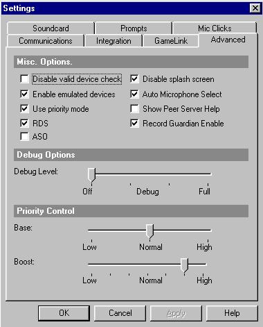 Fig. 4. BC Advanced SettingsChannels can be created in the client, when hosting a session, but only the server can create the channels when the session is created. In the client, the channels have to be manually created after the session is created. Click on the 'Create new folder' icon. Name your new channel, go into Hotkeys and setup key presses to be associated with the channel name you just created. Remote administration and an admin password permit the server to add/remove channels and kick players from a client. There is a BC server program available which is another method to utilize BC's channel option. Running the server program, either on a dedicated PC or on one of the client player's PC permits the creation of channels on the server. The 'Hotkey' function in the Battle Comm client allows setting up to 10 keys to change channels. All clients will need to connect to the server's IP address including the user running the server (i.e. The person running the server program on their PC must also have the BC client running and enter their own IP address to use voice communications). You can name the channels to indicate the group assigned to that channel with names like Package, Flight, Battle Wing, or my sister's cousin. Channels are an absolute necessity when there are more than four people online at the same time. Full duplex allows everyone to speak at once and you can bet in the heat of battle that everyone will.