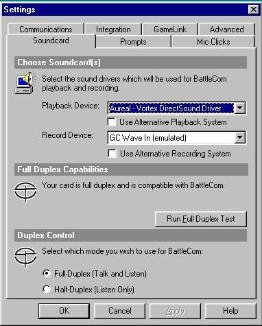 BC has a fairly generous assortment of adjustments to its setup as you can see by accessing Properties from the Settings dropdown menu. There are the standard setup pages for choosing your soundcard's playback and recording devices. BC will run a test to determine if your selections (and soundcard!) will allow full duplex operation (talk and listen at the same time).