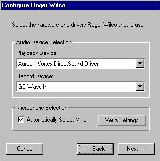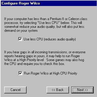 The next page MUST have 'Run Roger Wilco at High CPU Priority' selected to work with most every game released in recent memory. Frankly R-W uses very few CPU cycles. I have never detected any difference in frame rate with R-W on or off, even while testing loopback mode in a game. However, if you want to get that last 0.5 frame per second out of Quake then select 'Use less CPU'. These two options do very different things. High CPU priority means that R-W gets access to the CPU and the soundcard before any other program running. This is absolutely necessary to avoid gaps in your transmissions. You will get gaps at the worst possible times, when the action in your game is the heaviest. R-W can use less of your computer's power by using a less aggressive data compression algorithm. R-W uses data compression to reduce the amount of information it sends over the Internet. Your game is trying to send information too. Sometimes there is just not enough bandwidth for both. Selecting 'Use less CPU' helps you computer run the game smoother and helps your modem (and the game) communicate with your online buddies without data lose.