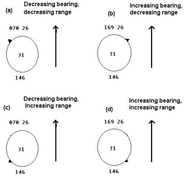 As a practical example, say your position is as shown in Figure 1(a) bearing 146, distance 31 nm, and that you're flying North. Suddenly, you receive a call from AWACS that the nearest threat is at bullseye 165, 20 miles, angels 20. Suppose you have established that you should engage, should you turn and if so, in which direction?