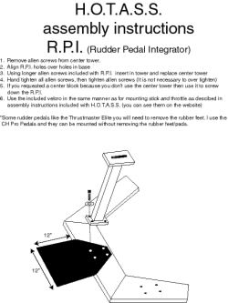 FighterSystems has created an add-on for the H.O.T.A.S.S. called the RPI (Rudder Pedal Integrator), an attachment that bolts onto the bottom of the center console. The RPI functions in a manner similar to the other H.O.T.A.S.S. attachments: The controller assembly is held in place by attaching the supplied Velcro tabs to both the controller and H.O.T.A.S.S. surfaces.
