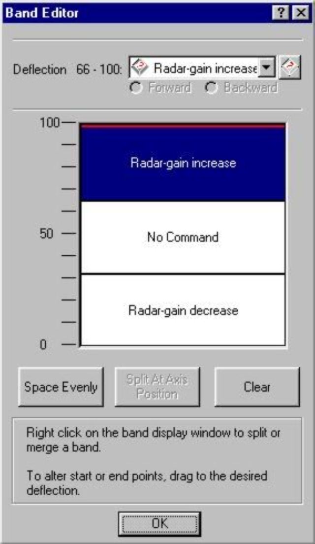 ![]() Fig. 8. Rotary Band Editor HINT: Program a "No Command" band to the center of the rotary. Make it a habit to center both rotaries before launching a game. Many strange behaviors that occur in games, which are blamed on the Saitek HOTAS, are actually a rotary or three-way switch sending out a steady string on commands because they are not set to a "No Command" position or band. I have solved dozens and dozens of users' problems that were simply having a command programmed (on purpose OR because they had not gone in to set a center band to "No Command") in pinkie-shifted mode which included the center detent of a rotary. Everytime the pinkie key was pressed a seemingly random command was sent to the game. This same kind of error occurs if one attempts to use all three positions of the AUX three way switch. A "No Command" position is required for every button (not pressed), hat (centered), rotary (centered or either end of the range), and switch (any of the three positions).