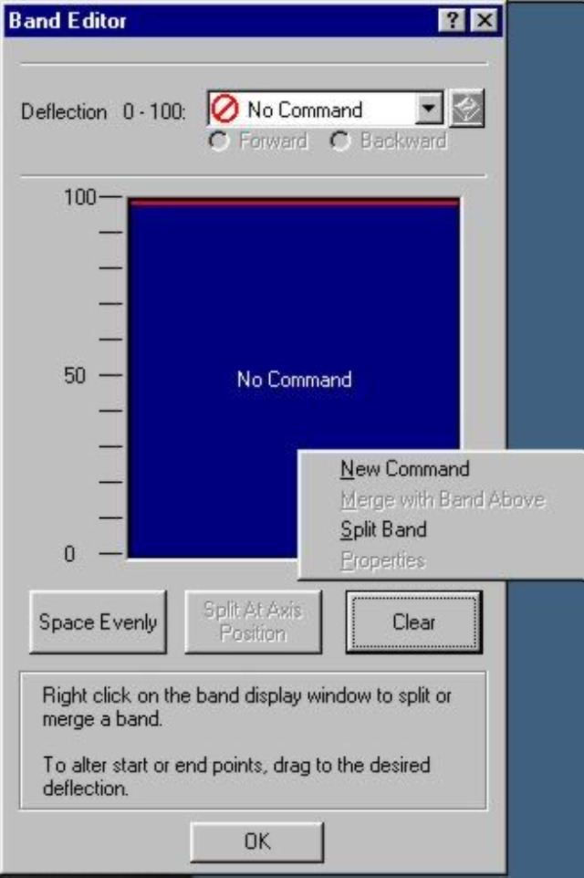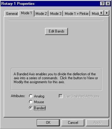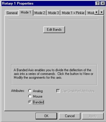 The Banded mode will probably be programmed most often and it is very flexible. For all you Saitek X36 analog users it is important to understand that this mode is very different from the old increment/decrement mode. This mode allows any number of commands to be programmed into discrete bands on the rotary. There is only a one detent centering each rotary so you could have trouble finding a specific command if you program twenty bands. Generally, about five commands, including a mandatory 'No Command' band is the maximum you can find reliably. A very important difference between the analog X36 rotaries and the digital rotaries is the Banded mode senses the position of the rotary at ALL times. The old analog stick only sensed motion in the increment/decrement mode. This was particularly useful for adjusting things like zoom in and out, or radar range. Make no mistake it had several irritating problems (like cycling rapidly between increment and decrement when left on the detent). The new Banded mode sends a command when you move into a programmed band. It will always send the programmed command when in the assigned band. To set up the Banded mode, adjust both rotaries on the throttle to full range.