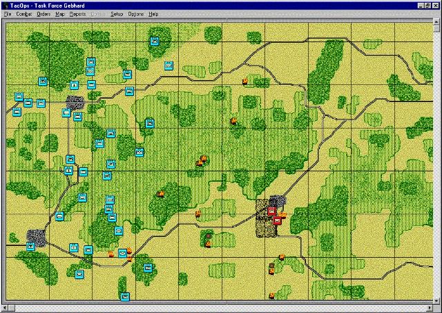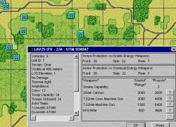 There is a wealth of supporting information, scenarios, and maps available at www.battlefront.com. Down in the Dirt TACOPS is a modern game of brigade combat usually played at the platoon or section icon level. It is able to support games with as small as a company action against a platoon or up to a brigade size force dueling it out. The heavy-weights of the world are prominent in the game - the M1A2 and the T80U, but the game also supports the medium weight forces in the Canadian Army and USMC, as well as light fighters (known to heavy forces as speed bumps). As a constructive simulation, it inhabits much the same ground as the Army's Battalion-Brigade Battle Simulation (BBS) or JANUS (which is not an acronym) and you are provided the typical helicopter-like view of the battlefield common to wargames. TACOPS does not use - or need - 3-D graphics or views. In order to achieve a rapid game pace, it uses rather "primitive" graphical icons much like counters used in manual board games, allowing the player to use either NATO standard or stylized icons. Players can switch sizes of the icons from small to large or to portray different information such as whether a counter has been examined, if it has been given orders, and its facing. In a game that may have over 100 counters under your control, this can be a very useful feature. A flashing icon and a direct fire line drawn between icons portray combat, or artillery or smoke bursts. When a unit is destroyed, it either vanishes or is replaced with a wreck icon. Flashing skulls indicate dead dismounted units. Equipment from several Allied nations appears in the game: US Army and Marine Corps, Canadian Army, the Australian Army, and the New Zealand Army. Also included is the enemy of freedom everywhere: the dreaded and ubiquitous Opposing Force (OPFOR). There is a photo file of most of the games equipment, so you can see what you are killing. Go to Part II.