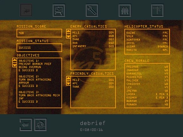 ![]() The core of the campaign is team management. You can build your own teams or allow the computer to build teams for you. But when you begin to fly missions, some of the tasks will fall into your own hands. I returned from my first flight I had one chopper down with two crewmen MIA. The debrief is seen immediately above.