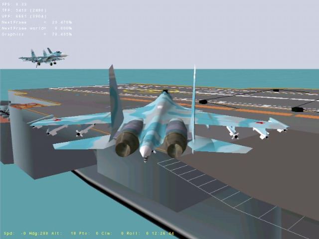 Mark Shepheard's Take on Flanker 2's Flight Model: The first astonishing improvement I noticed on my first flight is that when I did a full afterburner take off, the scenery flew by me in a flash. The sense of speed in Flanker 2 is at least twice that of Flanker 1.5...WOW! The entire aircraft feels heavier and much less twitchy than Flanker 1.5 as it displays a slower roll rate more in tune for an aircraft of its size. It feels like there is more inertia and weight modeled as well as drag when the brake, gear, or flaps are deployed. Control surface response at different airspeeds is very well modeled and the aircraft becomes sluggish in slow flight requiring larger stick deflections compared to when the aircraft is at higher speeds. Aileron reversal near critical AoA is also there which is a part of the envelope that is often missed in other sims. There is more speed bleed in high G turns than 1.5 with "Nagging Nadia" letting you know when you have reached, "Maximum G" and "Maximum Angle of Attack". Accelerated stalls are very well modeled when exceeding the critical angle of attack. Stalls are very well modeled and adding flaps will increase lift and decrease the stall speed as that is what happens in the real world. Any type of yaw when stalled will put you into an incipient spin and if you don't react quickly you'll be in a full spin in no time. Spin recovery is also well modeled needing opposite rudder and then a good pitch forward to break the stall once the rotation has stopped and you can really feel it breaking the stall. Inverted flat spins are also possible and are recoverable with the proper control inputs but are much tougher to get out of. Another well done aspect of the flight model is the altitude effects, both a higher True Airspeed as well as less fuel burn at the upper altitudes. Airframe efficiency is also degraded at altitude, as it should be. On approaching to land it is just like the real thing...attitude plus power equals performance and once you have the flaps, brake, hook and gear out and are on glideslope you set your power and make small adjustments to keep it stable. Compared to Flanker 1.5 you will have to hold a higher angle of attack on approach due to the better drag modeling and that runway comes at you fast! I also was able to easily do a forward slip that is used to decrease altitude at a high rate but not increase airspeed. This is done by banking a wing, applying opposite rudder to the bank, and pushing the nose forward which puts the side of the airframe into the airflow and acts as a very large airbrake. The differences in the Su-33 as compared to the Su-27 are many and starting with the physical characteristics are as follows: The Su-33 has forward canards just aft of the cockpit that generate extra lift forward of the center of gravity which is required for carrier take offs and landings. It also has split flaps and outboard ailerons instead of the flaperons on the Su-27. The split flaps extend to about 60 degrees to aid in the approach to the ship by decreasing the angle of attack and are, "split" in order to accommodate the folding wings when stored on the carrier deck. The tailerons also fold up and the gear of the Su-33 is much stronger with dual wheels on the nosegear as well as beefed up front and rear struts. There is also of course the box section tailhook under the tailcone and a nose mounted retractable in-flight refueling probe. The Admiral Kuznetsov aircraft carrier has no steam catapults and the jump ramp on the bow gives the Su-33 enough vertical momentum to allow it the few seconds needed to accelerate to a climbout speed. The flight model seems excellent here in that after the initial jump off the ramp you still have a few seconds of settling towards the water just prior to reaching a climbout speed, It feels very good! The approach to the ship in the Su-33 is somewhat different then the Su-27 since the large split flaps at 60 degrees create a lot of drag so a good amount of power is needed to maintain a stable approach. The ship comes up very fast and disappears under the nose on short final followed by a controlled crash onto the deck catching one of the four wires. As a note, with my head down in the cockpit I was able to complete a full approach to the deck from the outer marker catching the 3 wire all by the panel instruments alone with no HUD or outside reference. Flanker 2's instruments and flight model are THAT accurate...I was very impressed to say the least! The Su-33 also has different in-flight characteristics including different stall speeds and higher maneuverability then the Su-27 from what I found.