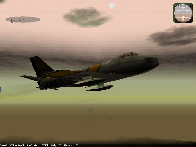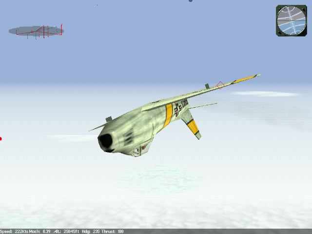 ![]() Near the Furball A minute or two after leveling off on course 295 my wingman calls out, "MiGs at two o'clock!" Not much time to plan now, I give the order to engage, jam the throttle to the wall, roll and break left. My wingman follows as I push the nose down then break high. I'm scanning for bandits and pick up a MiG behind me and at about 30 degrees off my tail crossing my path. Perfect! Eyes fixed (now in padlock view, a semi cheat view which is now looking across the outside of my aircraft toward my target), I complete my manouver and am down to 250 knots. This isn't much energy at 30,000 feet, but since the bandit is not heading directly away from me I dip my nose and begin to gain on him rapidly.