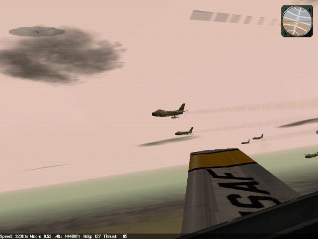 ![]() Sabre Squadron Roughly one hundred miles from our target waypoint I get a call from Dentist that we have bandits at 30,000 feet one hundred miles ahead. I call the squadron to spread out and drop tanks. The tanks are almost exhausted anyway.