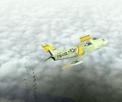 On the other hand the AA group did encounter bandits, and the bombers called out a report on a bandit position at least once, probably near Seoul. So why did they not attack? It could be because we were heading North to parts unknown, far beyond the FLOT. I was kicked out of ACCEL near Seoul on my second run through of this mission with notice from Rattler (the bomber group) of MiGs nearby. A moment later DENTIST (ground control radar, not actually present in the theatre until 1952 but introduced earlier by Rowan as a cheat for the sake of improved gameplay) also warned of a "MiG train heading south," but the position was much southerly of me and no threat to my mission. I went back into the MAP and used ACCEL to reach the IP. I adjusted my trim for 30,000 feet level flight and then took a good look around. You will find that your wingmen have sharp eyes, but it's a good idea to do your own scan of the sky also. At this point Rattler lead called out for me to stay close since I was rapidly pulling ahead of the group and they were turning slightly east toward the target.