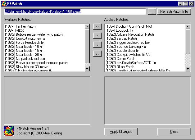 Select the patches that you wish to apply. You can read the short descriptions that appear when each patch is selected or peruse the Readme files that are in the F4Patch directory. Click on the ">" symbol to move the patches to the right hand list. Press 'Apply Changes' and acknowledge each modification to complete the patch. Reverse the process, moving the installed patches back to the left, to remove them. F4Patch will not install anything that it cannot remove.