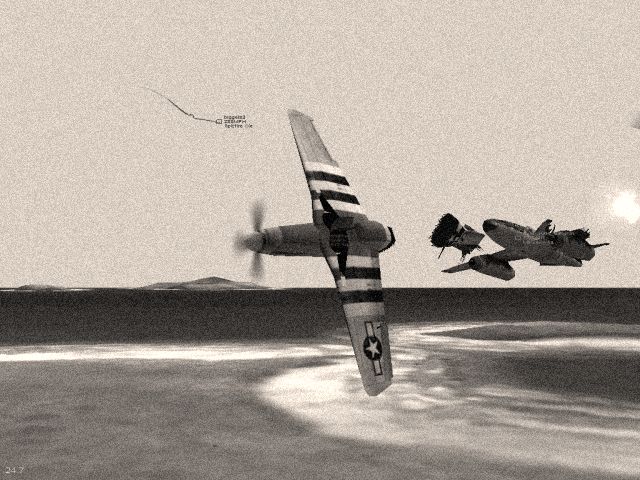 Fig. 6. An engine on the verge of blowing upThe day turned even worse for the Allies, as soon thereafter the Axis initiated a similarly configured attack in the African theater. This time they managed to destroy both the Gabes Bridge, an important link for the Allied ground troops, and the El Djem airfield close to it. Furthermore, the El Djem base was then captured by the Me-262s landing there, thus pushing the frontline further North. A single brave Allied pilot then tried to defend the airfield all by himself, but crashed nearby during one of the low level passes. An important addition to this mission was also the Axis use of a leased Japanese destroyer, which provided surprisingly strong anti aircraft cover.