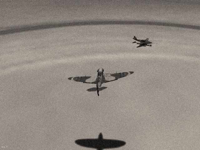 Fig. 5. A Spit chasing a 'jet' chasing a SpitIn the early morning hours that beautiful yet tense Sunday, the by now much feared Axis 'jet' planes initiated a simultaneous attack on a powerplant and an airfield deep inside the British territory. While the attack on the airbase was unsuccessful, the powerplant was destroyed and this marked the first progress in any of the bombing campaigns. The losses were not too high on any of the sides, but an interesting event was observed by some locals. A ditched 'jet' plane was destroyed by one of its own in order not to be taken and studied and perhaps even used in combat by the Allied side. Its pilot was taken as a POW.