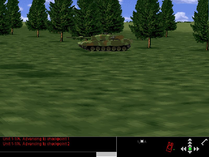 Fig. 4. A Leopard II stalks the woodsSteel Beasts is definitely a game to watch. In itself, it may fill the needs for a realistic playable modern tank sim. More importantly, its success may be a bellwether for the future of simulations. Several large companies have dropped out of hard-core sims because the market is to small for them to make a profit. Small companies have neither the need to sell thousands of units to justify a game to a board of directors nor a desire to please all gamers. On the other hand, they can't afford to take crippling losses. The sale of Steel Beasts may well show if smaller companies can fill the hard-core niche.