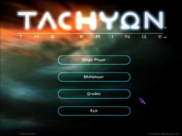 Fig. 2. Tachyon's Main MenuThe Interface is simple and easy to use. You have the choice of a Single Player Game or a Multiplayer Game (more on multiplayer later). When selecting a Single Player game, you can choose to load an existing game or start a new one. Once you begin a game (or continue one in progress), you will see one of a few Control rooms. From here you also have an Options screen that allows you to set customize Graphics, Controllers, Sound and keyboard mappings.