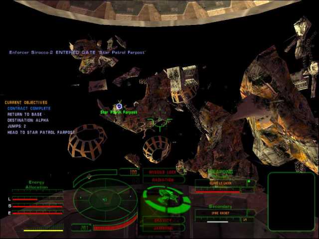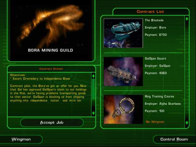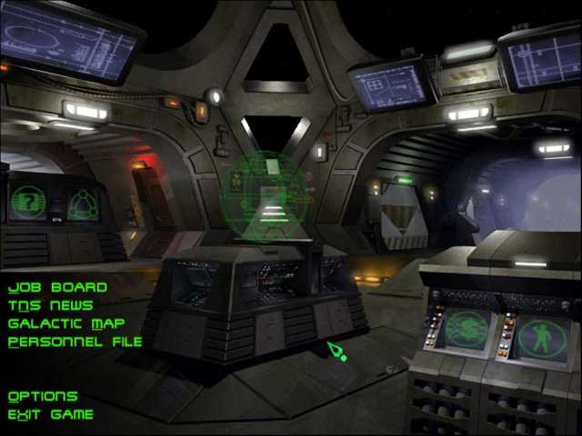 Fig. 3. One of Tachyon's Control RoomsThe next interface you will spend a lot of time in is the Job Board. From this screen, you can view the current available jobs. Selecting a job will give a text summary of the job, which is spoken to you by the person offering it. From this screen you can also enter the Wingmen screen, where you can hire/release a wingmen. Wingmen have an upfront fee, plus they take a percent from the job's pay. The better the wingman the more they cost. Once you select a job you enter the hangar. From here you can modify your ship with available weapons and equipment. The shipyard shows any ships that are available for sale. rom this screen you also launch the mission.