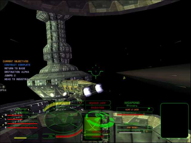 Fig. 6. Escort mission complete!One thing that I like is the roll. If you don't have rudder pedals or a twisting joystick, then you use keyboard commands to roll the ship. But if you do, then you use the rudder pedals to roll. At first this seemed strange, but after some practice it becomes natural. You can even coordinate the controls and fly the ship to behave like an airplane.