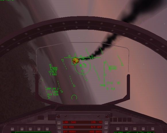Just then, between the HUD and the canopy bow (about right 12:30 to 1 o'clock position), I saw the leader explode! The best visual description I can think of is if you held a torch from one of those Hawaiian Luau party, and swing it through the air. The flame with a extended tail trailing the torch is exactly what I saw! Turning my attention back to the trailer, the trailer exploded into a streaking flame seconds later just as I tried to uncage the missile the third time! Never mind!