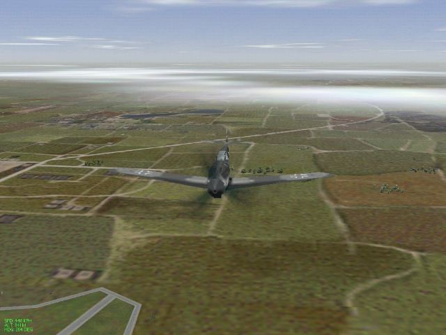 ![]() I am brought back to "reality" by my wingmans' call that he is in trouble and I roll quickly and loop to find him. I call "target friendly" and get lucky.. he is the first friendly I lock. I see the P38 Lightning on his tail. I am lucky and get a piece of the P38 in my first pass, even though angle off the nose is close to forty-five degrees. I must have caught a control surface because the Lightning is sent spiralling earthward, out of control. My stick feels like lead with my speed exceeding 550 knots, but the controls lighten up as I pull the nose up and cut the throttle. Back to my primary task of eliminating bombers...