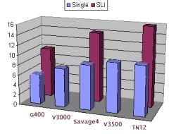 ![]() New 3d Accelerators. From the chart you can see that at 5 million triangles per second fill rate, the G400 is a bit behind the cutting edge. However, place two of these boards in a single system and you have more power than even the top of the line Voodoo 3500 can generate. Interesting, no? At the extreme right of the chart I show the fill rate for Voodoo3 model 3500 and TNT2 as approximately the same at 8 million triangles per second (in fact TNT2 Ultra will exceed this number). The chart does not show an SLI speed rating for the V3 chipset, because 3dfx has not expressed any interest in an SLI mode, at least not publically. In our last Game News piece I detailed some of the developments around Metabyte's SLI technology.