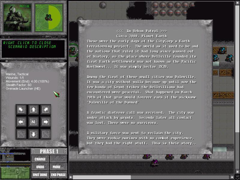You receive a short briefing before each mission, outlining the goals and setting the scene. There are turn limits on many of the scenarios to prevent stalemates and create a sense of urgency. Nominally, the game has a sci-fi setting. Giant CityCorps are warring for a limited number of planets. In the campaign, you are a member of the Bellville CityCorp, which has come back to resettle Earth, which is a wasteland. The natives, called "grunts," do not fancy this idea, and there's your pretext for war.
