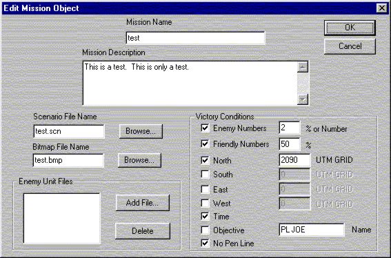 Fig. 7. The Mission parameters screenIn order to develop a good scenario, they player would be wise to assemble a great deal of reference material: a map of the region or a sketch map of the area made by the author, a detailed order of battle list for both sides (of course, the player can always choose existing ones), develop a matrix that ensures that each weapon can engage every vehicle in the scenario, and a strict list of victory conditions. After the scenario is developed, multiple plays are required to ensure that the system is balanced.