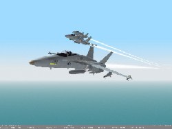 Fig. 1. Flanker 2.5 Hornets on CAPIt was with some trepidation, however, that I turned to the south and made my pilgrimage to the game-geek Mecca of E3. After all, it was starting to look like the closest thing to a new non-prop combat flight sim would be the Guillow balsa glider in Army Men 7: The Battle of the Shoe Tree.