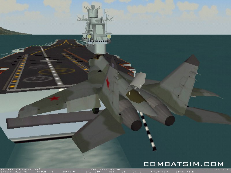 Fig. 7. Landing the Mig-29kSuffice to say that the MiG-29K is slightly more challenging to fly, especially to land than its larger Sukhoi counterpart. The very different flight model and beautifully rendered new panel graphics remind you that this is not just a new skin, you are flying an entirely different aircraft.
