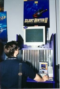 ![]() Thumbs Down to the sim companies as a whole because they didn't. Thumbs Up to EA/Jane's who got pictures of Xena, Warrior Princess flying F/A-18. Ok CJ, where are the pics? Thumbs Up to ME for remembering to bring sturdy walking shoes and my knapsack to carry my E3 literature in. ![]() Our intrepid Editor at SSI Thumbs Down to ME for forgetting to set my voice tape recorder properly and loosing some valuable "question and answer" time. Damn this new fangled technology. Thumbs Down to Dan "Crash" Crenshaw for forgetting his camera on one particular day, and not allowing us to take pictures of Bubba Wolford in front of the "Bubba's Hunting Lodge" display and the entire COMBATSIM crew in front of the Mattel Barbie display. Damn, lost opportunities. (By-gones) Well, there's always next year!