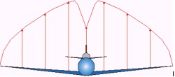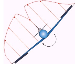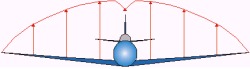 ![]() If the pilot decided to pull to the ultimate load factor of 9Gs (6G x 1.5), it would theoretically result in both wings failing simultaneously. In practice, variations in construction and/or material properties would probably mean one wing failing sooner than the other. So does it mean that as long as one pulls Gs up to but not beyond the limit load factor, everything will be okay? The answer is that it depends on the situation. In certain circumstances, pulling up to the limit load can still result in structural failure. The introductory anecdote alludes to this. Failure Under Assymmetrical Loads Suppose you're in a situation described at the start of this article - a high-G defensive spiral. Without roll inputs, the lift loading would be pretty much symmetrical as in the previous diagram except that the aircraft is banked and pitched nose down. Now, suppose the pilot decides to aggressively roll out of the bank while still pulling at the limit load factor (measured along the centreline). What happens then? Lift on the down-going wing is reduced while lift on the up-coming wing is increased as shown.