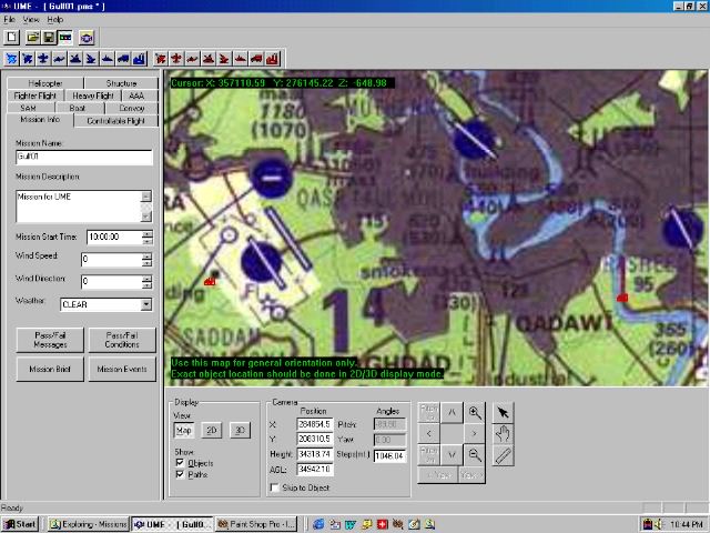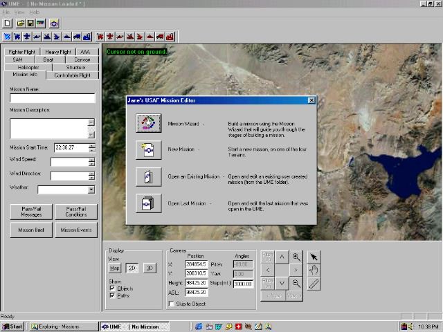 ![]() USAF Mission Editor Which brings me to the very cool User Mission Editor, or UME. I don't know why, but Jane's printed documentation is very quiet about this powerful tool. For those of you who have USAF and don't know what I'm talking about, it is buried deep in your USAF folder (default path is C:\Program Files\Jane's Combat Simulations\USAF\Resource\Missions) provided you bit the hard drive bullet and did a full install. It can be put in through a custom install also. The UME allows you to create some highly complex missions in any of the four available theatres, including the ability to script intricate "If- Then" causal events and triggers. All of the objects in the USAF world, be it user flyable aircraft, AI controlled weapons systems, or even static buildings from skyscrapers and grass huts, are available for the creation of a playground to blow stuff up in. Up to four User controlled flights can be generated, along with as many AI aircraft as you have the time to set up. While presented in a fairly intuitive GUI interface, the capabilities of the UME can be pretty intimidating. The "Wizard" tutorial is a great help in getting ones arms around this beast. Still stuck? Excellent HTML documentation is available online. The SPOT satellite imagery is gorgeous to behold. Such info as terrain elevation is right at your fingertips, allowing you to route packages through valleys and the like. Of course, the ability of your AI flight to successfully fly your mission is problematic. What is the truly cool thing about building your own large-scale a mission- as in the canned Campaign missions, all mission goals must be met…but you set that goal! Want to create a huge tank-plinking mission, leading a herd of Warthogs through the Fulda gap? Go ahead and build it, omitting the bothersome opposing air force. This allows you open T-80's like tuna cans and without worrying about the lobotomized friendly AI stumbling around 20k' above you flying CAP like the Three Stooges on heroin. UME Limits and Needs While the UME is definitely a huge "plus" that adds to the appeal of this diversion to the hardcore simmer, it is not without some very frustrating problems. I don't consider my system a slouch, but for some reason navigation on the map is a tedious affair. I'm not sure if it the graphics intensive SPOT imagery or what (though I doubt it, it still chugs in Map mode), but trying to drag your view around the theatre is an exercise in patience that would make a Zen Buddhist reach for the Jack Daniels- straight up. Setting waypoints is similarly annoying…do I have hold of the point I want to move, or not? Must be one of the "if-then" triggers- "IF I could set my waypoint over the target THEN I might actually be able to fly this damn mission tonight". Annoying. In accordance with the old adage about leading a horse to water, as far as I can tell there is no way to get your flight to actually take on fuel from a tanker, even when an actual hookup is performed. This is a big deal in the Vietnam theatre as there are no friendly airfields either! Note to Jane's- let's see some blue bases in the south, OK? Or, even better, the ability to place airfields anywhere a structure can. Another problem I have with planning a mission using the UME- well, actually all missions in USAF…stealth does not appear to be modeled very well. While, as recent experience in Kosovo can attest to, there is no deterrent against the Mark 1 Eyeball, low-observable radar shapes such as in the case of the F-117 do not appear to work much better than F-15Es. Just a random thing I noticed while trying to emulate a Kosovo-esque runway denial / SEAD mission. This may come across as "piling on" the UME, but I enjoy mission building almost- I repeat, almost- as much as flying them. The USAF UME has the potential of being one of the most powerful mission editors for a sim- period- and it's painful to grow old trying to design some really Uber-strike on the Luxor in Vegas. The ability to build a scenario in four different terrains and then try and make it happen is a powerful thing- it would be a pity to let some easily resolvable problems cripple it. Go to Part V: Views and Graphics