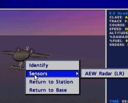 ![]() First of all, you do need to know a bit about the more active defenses on board your carrier. This leads to my first rule of naval engagement: Increase Your Vision. Launch your E2 Hawkeye immediately, followed by your EA-6B Prowlers. The Hawkeye enables you to see a long way around you without making your carrier group show up like a sun in the night with its active sensors. The Prowler can jam another ship's radar, making it hard for that ship to defend against your Ship to Ship Missiles (SSMs). Those Quirky Sensors At this point you run up against the first quirk in Fleet Command. You must manually select the E2 and order it to turn on its EW radar systems. In fact, you must do this with every aircraft you deploy or they will fly blind.