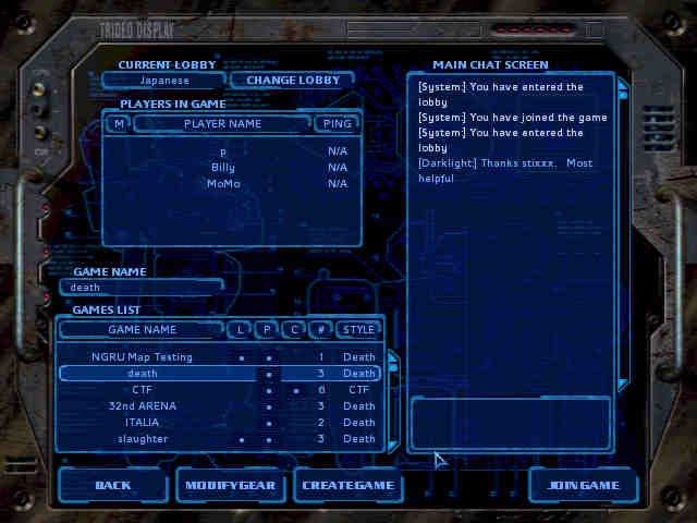 An odd addition to HG2 is the Secondary Movement System or SMS. The SMS is basically skates for your Gear. When you use SMS, you can travel much faster than walking. The sensation of speed while using SMS is quite a rush! The SMS is used when you need to get to your destination quickly. This also helps speed up the time required to move from destination to destination. Other movement features in HG2 are the ability to drop and pick up items. If you destroy an enemy Gear, you can pick up his hand held weapon. If you are low on ammo, this might mean the difference between life and death. While the Gear's movement is a little too human for my tastes, the movement is still great. Multiplayer Action Multiplayer action in Heavy Gear 2 is as simple as hitting the multiplayer button and creating a new callsign. The connection to the Activision multiplayer servers is automatic and simple enough for a 6 year old to accomplish. Once connected to the server, you will find yourself in the lobby where you can choose from any game in progress or you can start you own. You can engage in duels (1 on 1), deathmatch, capture the flag, and strategic combat where you simply guard your base while destroying the enemy base.
