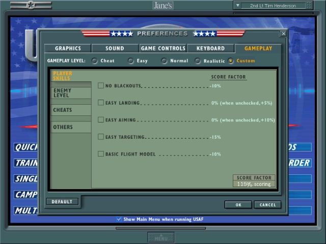 ![]() My system defaulted to 1024x768 but not all the options were turned on. I made that correction, and then turned off the training aids (Easy Aiming and Easy Targetting were turned ON by default.) When Tim "Flyboy" Henderson installed USAF, it failed to detect his AMD Athlon 600, instead deciding he was running a K6-3 400. It looks like Jane's have optimized for the Pentium III but have not optimized for the Athlon. Too bad, but maybe this will be rectified in a patch. Btw, I've been running under DX7 on WIN98 OSR 2. Go to Part II