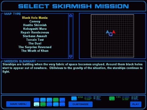 ![]() With these options, the game allows you to create just about any conceivable scenario, from a small group of Klingon Birds of Prey swooping down upon a lone Federation cruiser, to a full-scale encounter between multiple dreadnoughts or battleships. Perhaps better yet, the developers have included a number of custom skirmishes, such as the legendary Kobayashi Maru, or the clash between certain Federation cruisers in the Mutara Nebulae, titled The Wrath of Khan.