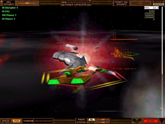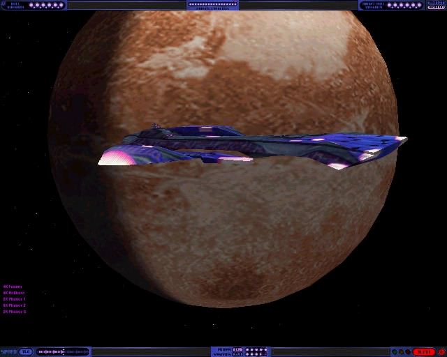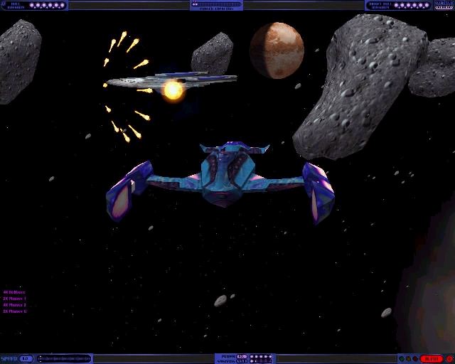 ![]() The main gripes with the Dynaverse system is that as often as not, players will find themselves struggling to ascertain mission requirements, or faced by enemies illogically placed, such as Romulan vessels deep within Klingon space. Most of these problems have since been resolved with a patch, but they are nevertheless an annoyance to gamers lacking internet access (something that'll one day be displayed at the Smithsonian, unjacked human beings). Having gotten the less-than-fun stuff out of the way, let me talk a little about the richness of Starfleet's campaign mode. You create your character and track his/her progress throughout the campaign, earning medals, receiving promotions, acquiring new, larger and more powerful vessels to captain, eventually commanding up to three crafts in later missions. The game allows ships to be renamed and almost completely refitted in spacedock, where you can upgrade both weapons and crew. Most of these decisions cost in terms of the game's one resource, which is prestige. As you move through the campaign, successfully completing missions, your character acquires prestige points that can be used in the above manner, but don't think of prestige so much as currency as reputation or influence. A Federation officer wishing a new ship may earn it in the eyes of his superiors while a Romulan may use assassination to remove a fellow officer also in line for promotion. As mentioned earlier, the campaign missions are a liberal dollop of randomly generated affairs with custom-built missions sprinkled throughout. These latter missions become more prevalent as you enter into your race's special forces, if you choose to do so. With the amazing flexibility of SFC's combat system, the missions are at times quite varied in their requirements. On top of the standard weaponry, such as phasers, photon and plasma torpedoes, and hellbore cannons, there are attack shuttle craft, tractor beams (which have a nice graphical touch), boarding parties (nothing like transporting that squad of marines across downed shields to attack a specific component of an enemy ship), and missiles and mines. The combat, while real-time (which can be adjusted with the bracket keys), takes on an incredible tactical flair with so many options at-hand. There have been times when I was hot on an enemy's tail, his aft shields down, my weapons recycling for another salvo, my victory imminent, only to have the opponent conduct a HET (high energy turn), lock me in place with a tractor beam, and then fire a spread of photons across my forward bow (can we say Khan?). |