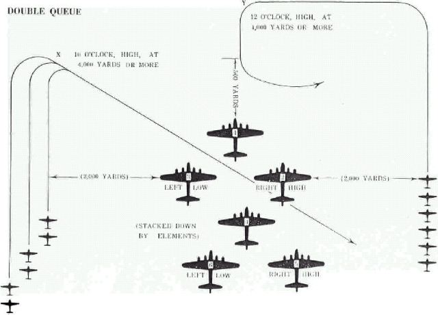 At point X, the fighter peels off to right or left and does a shallow dive until out of range of .50-caliber M/Gs of Fortresses.
