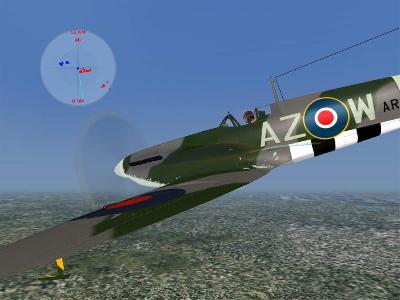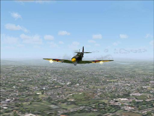 Flying these planes in FS2004 is a lot of fun. As I said, the detail is great. It is not quite revolutionary but certainly compromises are made to allow frame rates to remain high. On my 2.66 GHz P4 system with a 6600GT card, the models run quite well. Models are visually comparable to any of the better models in FS2004. Sounds are great, as to be expected. The flight characteristics are very realistic and Just Flight has attempted to make each plane historically accurate to its performance. They paid particular attention to accurately duplicating stall characteristics. As far as I could tell, they did a very good job. The CFS3 stock Spitfire feels quite a bit different from the JF versions especially in roll and stall performance. I am sure the JF version is far more accurate in this sim as CFS3 had a bad reputation for arcade-like flight models out of the box. This is a great plane set to buy if you want to fly a more realistic Spitfire, or several. In CFS3 they have guns and bombs of course, but in Flight Simulator there is a gun effect added. It works for screenshots and little more as this gun effect is not capable of destroying anything--FS2002 and 2004 do not support ballistics and damage models. It is mapped to the smoke effect key, however. Here is a demonstration in FS2004. I thought this was well intended but a bit silly. It does nothing really and due to the way the key press is captured it fires once, then stutters, then repeats rapidly. So you get a Rat......tat,tat,tat,tat. This is a limitation of FS2004.