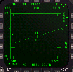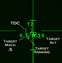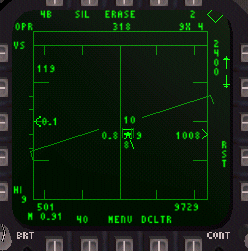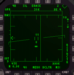 ![]() Velocity Search in the F/A 18E has two scales: 800 knots closure and 2400 knots closure. The display is divided into quarters by tick marks in the horizontal axis, and placement of the target on the scale half way up the display would represent 1200 knots closure in the 2400 knot scale. Tactical Designation Cursor - The Target Designator Control (TDC) cursor displays antenna scan pattern altitude coverage. The TDC cursor may be superimposed on a target and then designated for potential weapons employment. This is best utilized in the long-range Velocity Search or Range While Search modes.