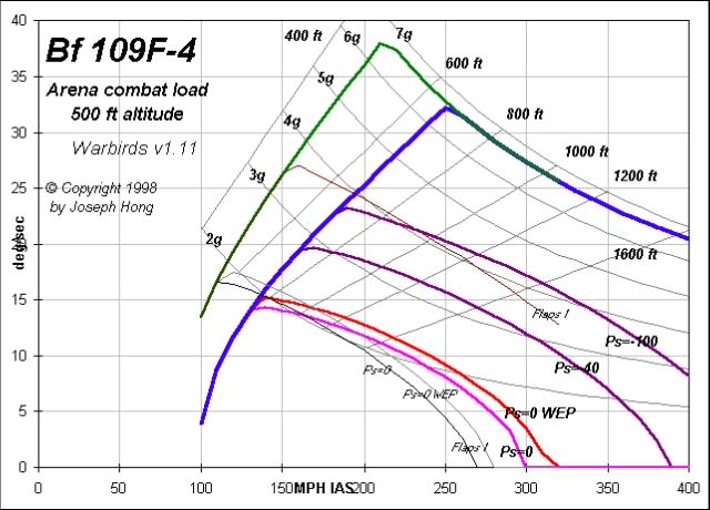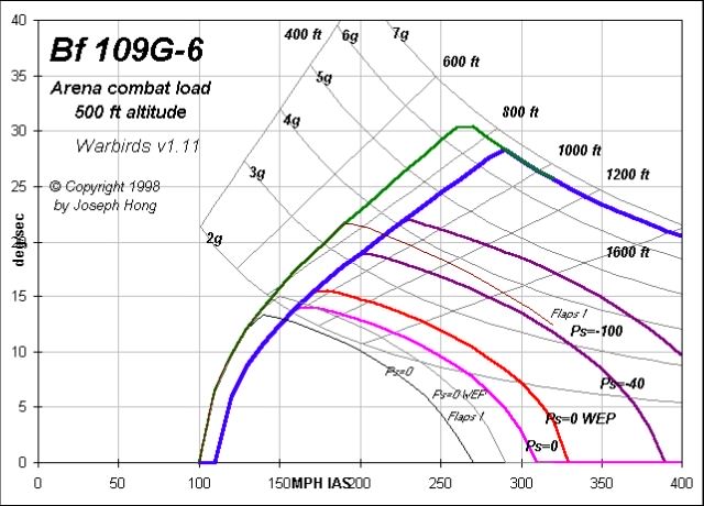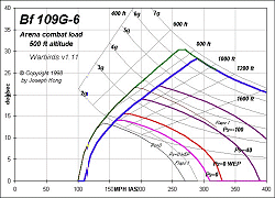 And this is why it doesn't pay for an energy fighter like the Mustang to Turn and Burn with a turn fighter like the Lightning. The charts clearly show that the P-38 is a superior turning aircraft versus the P-51. Their turn performance envelopes are identical, but the energy contours determine the advantage of the P-38. But, yeah, we all knew that. The question is, can we use this chart to see how the Energy Fighter can defeat the Turn Fighter? The answer lies in using one's strengths to defeat the other's weaknesses. Observe the lines of constant excess power (Ps) in each chart. In the P-51 chart, its Ps contours are straight and do not fall off quickly at higher speeds. For the P-38, the Ps lines curve down quickly beyond 300 mph. This means a P-51 retains energy better in a turn with moderate G and very high speed (3 Gs at 350 mph). Any P-38 attempting to keep up will lose speed very quickly. The P-38 chart shows that it is most effective within the speed range of 150 to 270 mph. In the regime of 200-270 mph it can perform energy-efficient hard turns. Turning with a P-38 at this speed is therefore a mistake. Its speed must be bled away further with techniques such as Boom and Zoom. When the P-38's speed drops to 170 mph and below, it can't pull hard turns any more. If the energy fighter has kept its speed up, this is the moment of advantage. The P-51 turns quite well between the speeds of 180 and 270 mph, especially with combat flaps. Using the P-51's good instantaneous turn at these speeds allows it to make some kills. It pays for this with a substantial energy cost, but that should be acceptable since it doesn't have a good sustained turn anyway. As an exercise, let's now compare the P-51D versus the Bf.109G-6. The chart of the Bf.109 shows a less capable turn performance envelope than the P-51. However, with WEP it can hold a sustained turn at a slightly better rate. Between the speeds of 200 and 300 mph, the energy contours of both planes at full power are quite similar. If the Bf.109 employs WEP between 200 and 300 mph, it can suck the P-51 into a sustained turn fight where the German aircraft has a slight, but lethal, advantage. The charts indicate that the P-51 using combat flaps in a max diving turn should be able to out-turn the Bf.109, but this really needs to be verified with your favorite WWII air combat simulation.