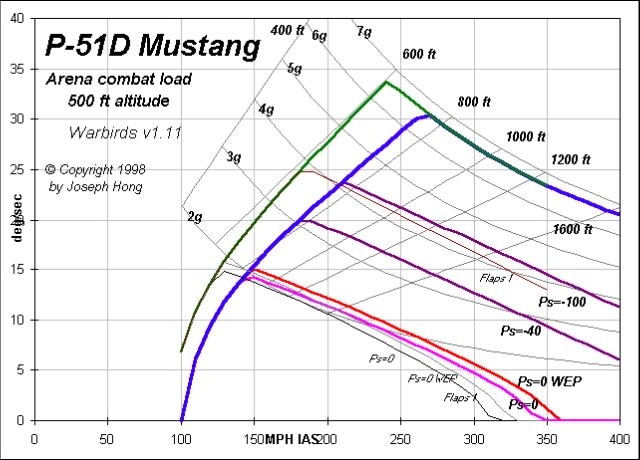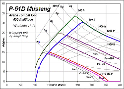 The previous article on Energy-Maneuverability (EM) charts explained only the meaning of the individual lines on the diagrams. Now we'll discuss how to compare the performance of different fighters using the charts and how to take advantage of the information presented. To exaggerate the differences in aircraft performance, let's take a turn fighter and an energy fighter's charts. We'll use the previous P-38L chart and compare it with the P-51D chart. Our starting point is each aircraft's best Sustained Turn point: the P-38L can sustain a flat turn using WEP and one notch of flaps at an indicated airspeed of 160 mph, while the P-51D with WEP (and no flaps) flies at 150 mph ias. At the sustained turn point, the P-38 turns at 19° per second while the P-51 does only 15°/s. This illustrates the P-51's weakness in turning, but is rather meaningless. In a dogfight each plane will use higher rates of turn to gain or deny advantage, despite the loss of energy this incurs. The P-38 is more apt to use a diving turn with one notch of flaps and full power only. This is represented by the Ps=-100 line, giving an ias of 200 mph, a G-load of 4.5 Gs, and a good turn rate of 26°/s. If the P-38 were to try a flat turn at this G-load, it would bleed away its speed instead. The dive of 100 feet per second allows it to exchange altitude in order to maintain speed (and thus turn rate). The P-51 can attempt to do the same diving turn (flaps 1, full power) at 190 mph and 4 Gs to produce 25°/s for the same energy loss. So, by burning up some energy (in the form of altitude), an energy fighter like the P-51 can in fact turn with a stall fighter like the P-38, but only until altitude runs out. We now extend this to analysis of Corner Velocity. With flaps 1, full power, and a 6.67 G load, a P-38 at 240 mph can do 33°/s. The P-51 at 240 mph can hit 34°/s, surpassing the P-38 for the briefest of moments! But here we see something very interesting: the distance from the Ps=-100 line to the lift limit line shows how severe the energy loss is for the maximum instantaneous turn. The gap between these lines is in fact smaller for the P-38 than the P-51! This means that the P-38 is more energy efficient during max instantaneous turns than the P-51. While this is surprising, it is quite logical for turn fighters to be more energy-efficient in hard turns. This is why they can sustain better turn rates. |